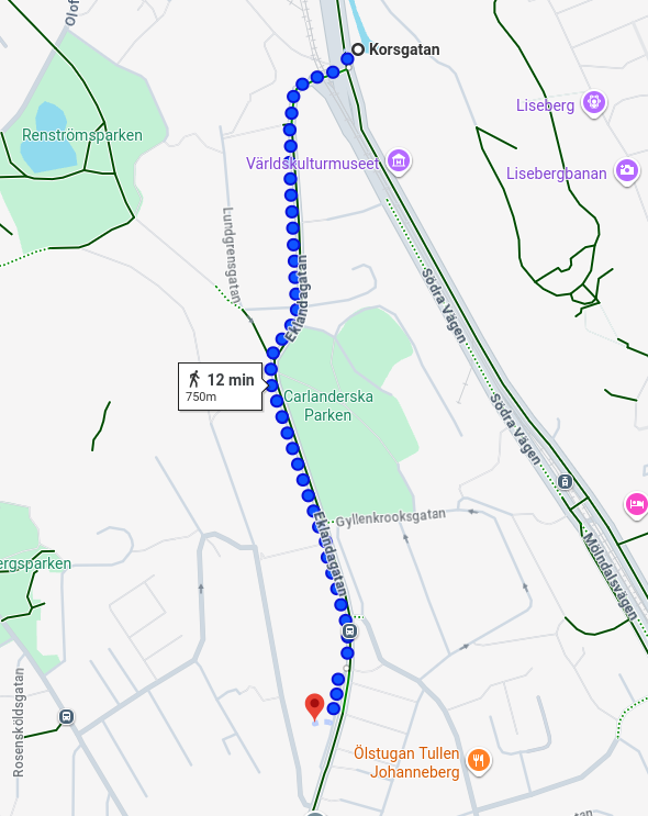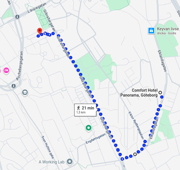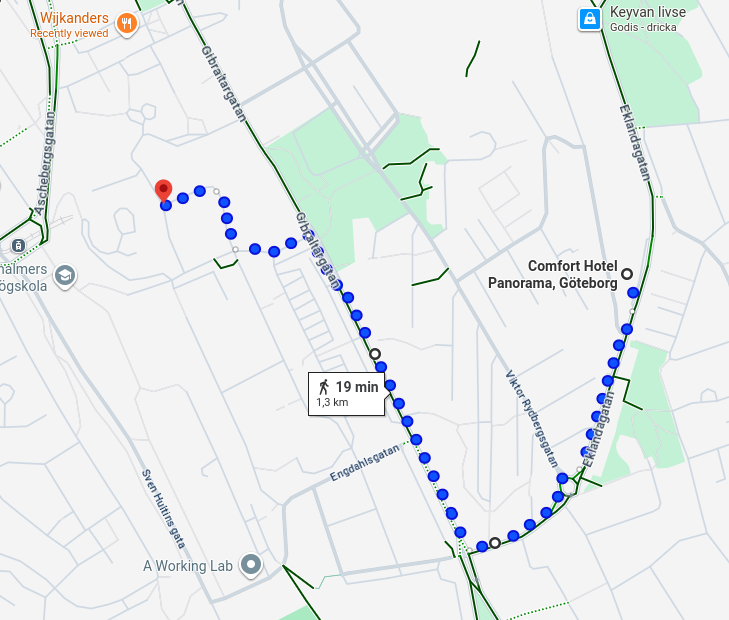 The following link gives the route from Hotel Panorama to the meeting place. If you stay in another hotel, just use the name “kemigarden 1, Chalmers” in google maps.